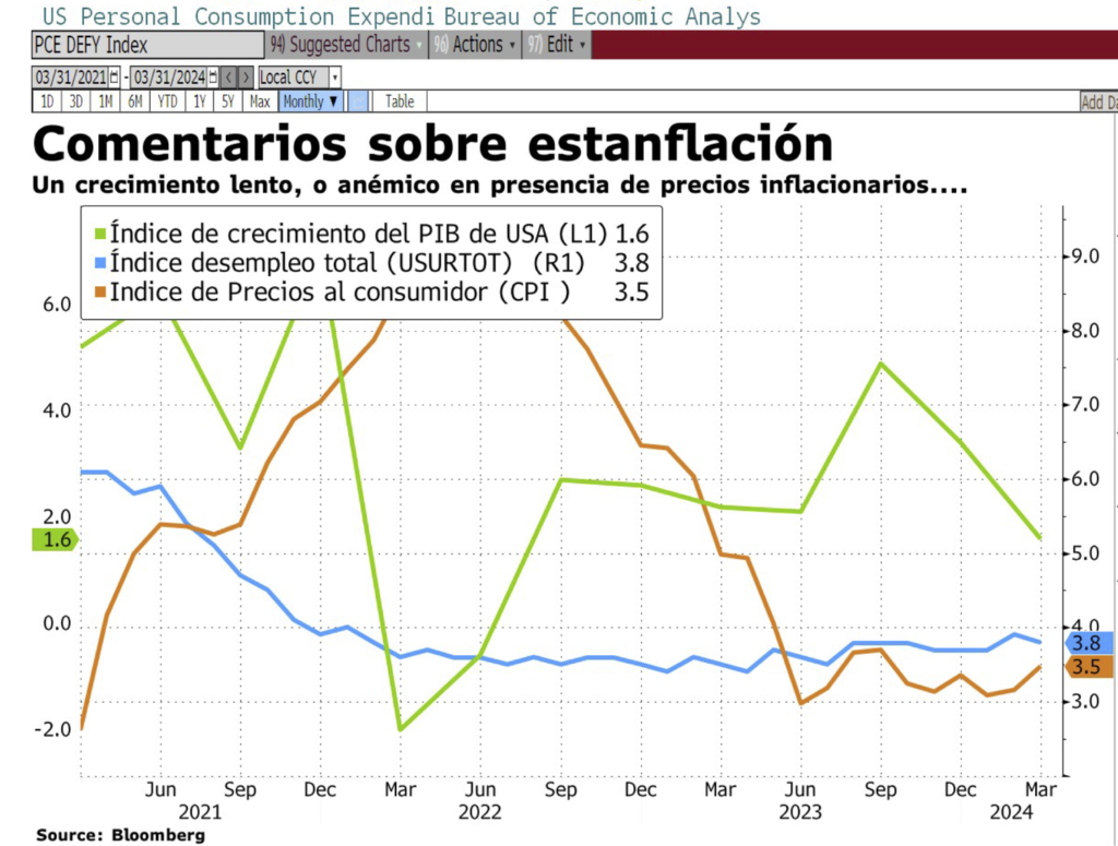 Esta semana fueron publicados dos de los más esperados indicadores macroeconómicas del primer trimestre en Los Estados Unidos: El Producto Interno Bruto (GDP), y el denominado Core PCE price index (índice de precios del gasto en consumo personal). Ambas cifras resultaron desfavorables y opuestas a los pronósticos, lo que ciertos analistas advierten como síntomas de alguna incipiente estanflación.