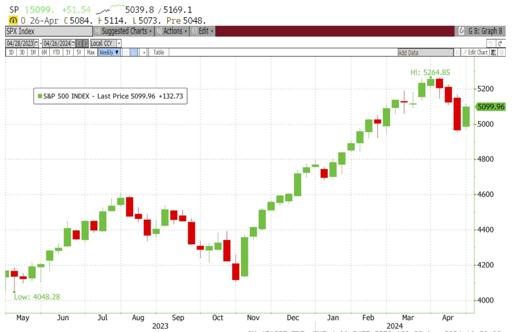 Ya para el día viernes, cuando se disipan las preocupaciones ocasionadas por las cifras macroeconómicas, y los analistas ajustan sus criterios sobre su significado, el mercado regresa a enfocar la atención en los robustos reportes de las empresas para la Earnings Season Q1-24; y el Índice S&P 500 cierra al alza con su mejor semana desde Noviembre 2023.